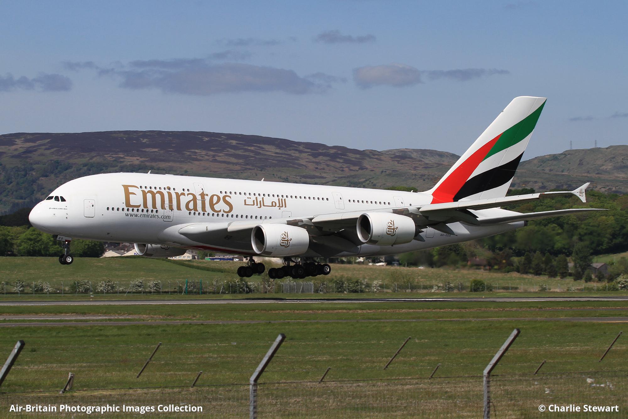 A6-EEO Airbus A380-861 Emirates (EK / UAE) Glasgow - International (GLA / EGPF), UK - Scotland Charlie Stewart - 06/05/2025